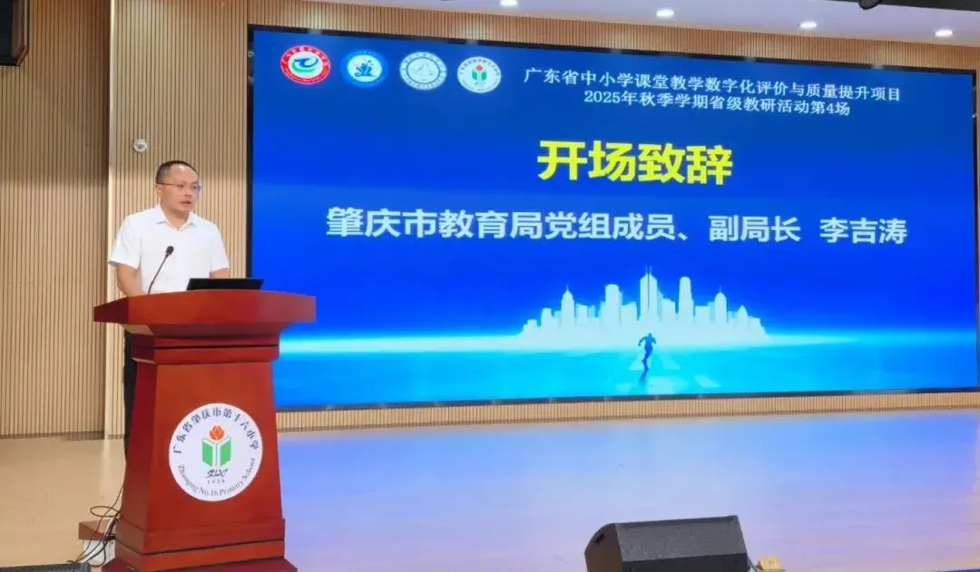 李吉涛在致辞中介绍了肇庆市CSMS项目现阶段取得的成果,并对下一步工作提出要求。他强调,全市小学数学教育工作者要深入研习新课标与教育数字化政策要求,积极推动CSMS工具及循证方法与课堂教学深度融合,持续优化教学设计与数字化教研资源共享机制,助力肇庆市小学数学教育实现全域优质均衡发展。