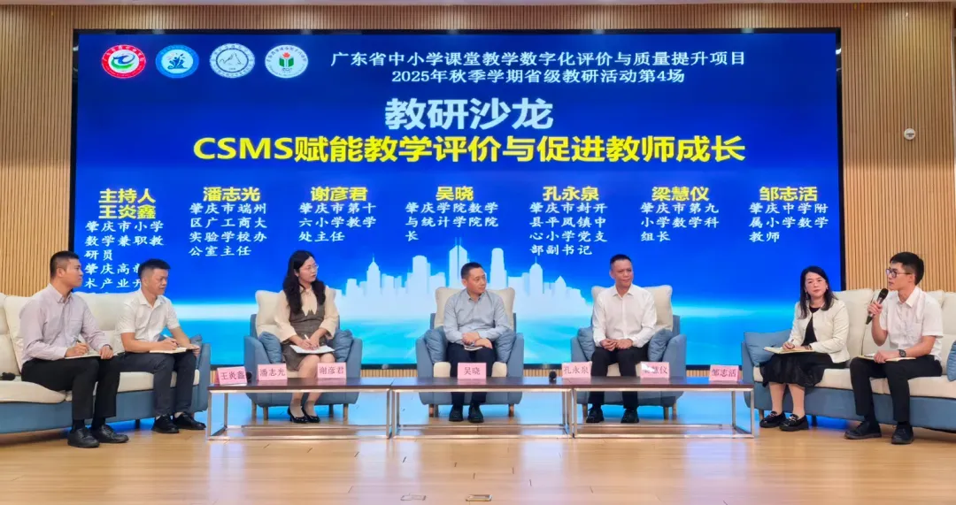 教研沙龙环节由肇庆高新技术产业开发区中心小学副校长王炎鑫主持。7位嘉宾围绕“CSMS赋能教学评价与促进教师成长”主题,聚焦“好课生成”“教研转型”与“教师成长”三大话题深入交流,通过一线真实案例,深入交流了CSMS如何以数据为镜,精准诊断教学行为,推动校本教研从“经验主导”迈向“实证驱动”,并成为教师专业发展的“加速器”。
